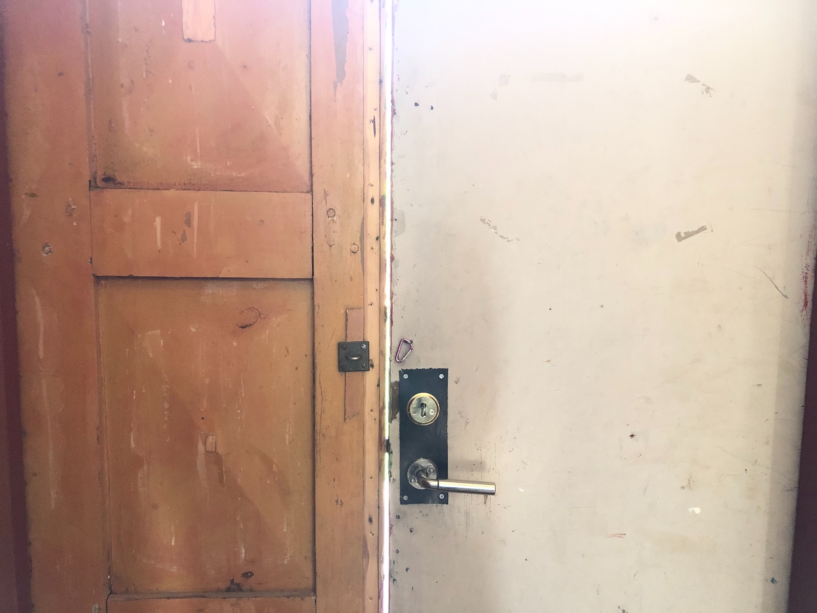 Dörrar i stort behov av renovering...Här drar det rakt in i groventré och kök när inte innerdörren är stängd.