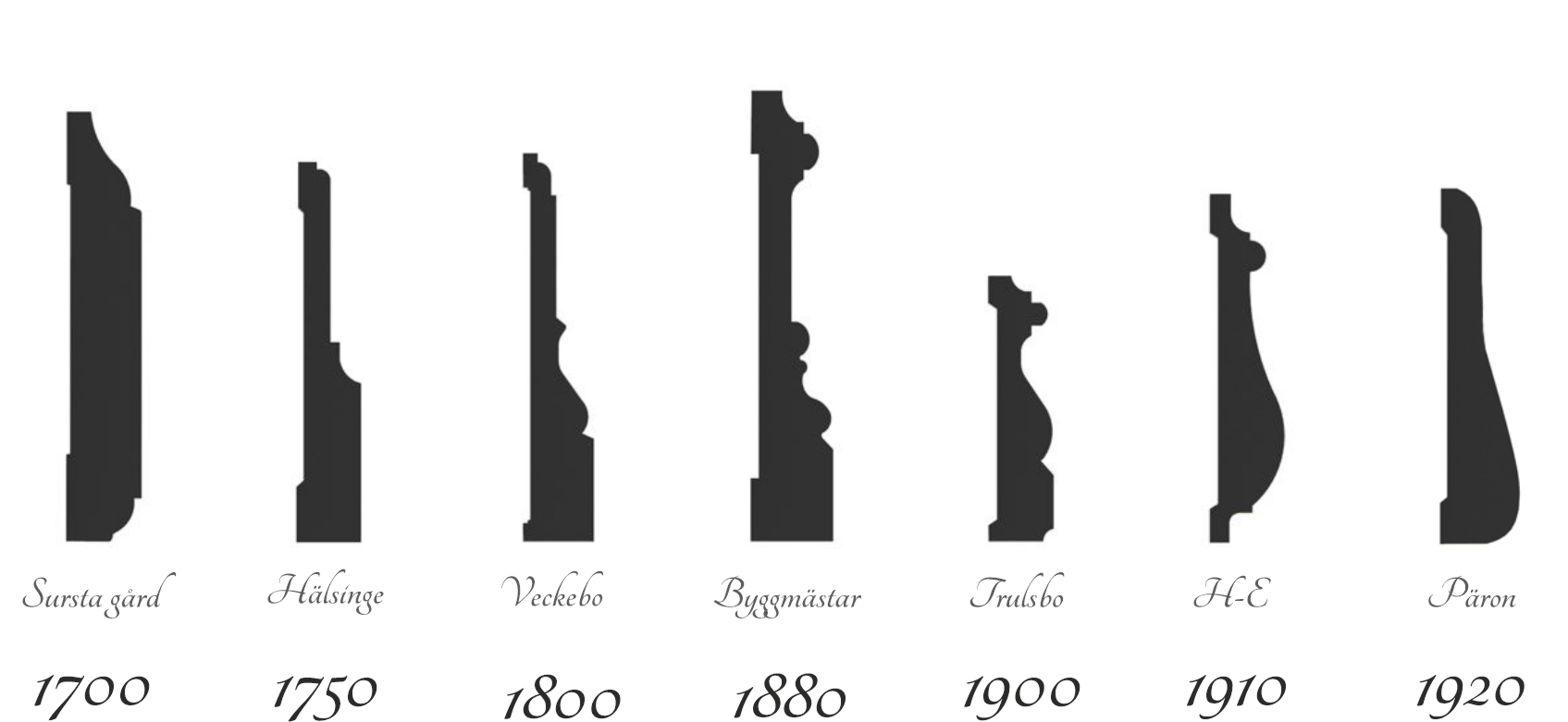 Alla stilepoker har sin egen trendhistoria och nedan kan du se hur profilerna på golvsocklar, taklister, dörr- och fönsterfoder utvecklats genom tiderna.